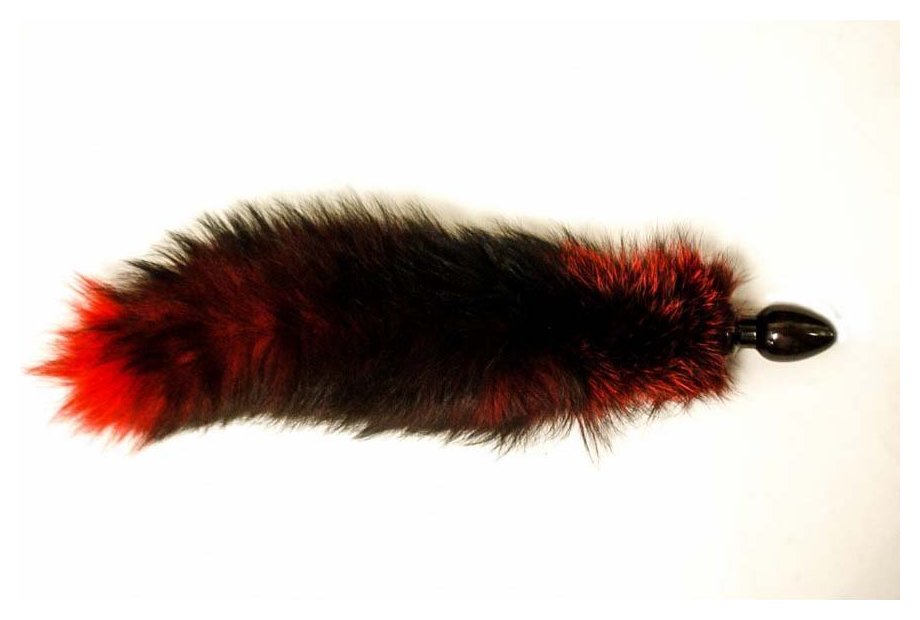 Анальная пробка черного цвета с тонированным красным лисьим хвостом, который выполнен из натурального меха.
