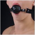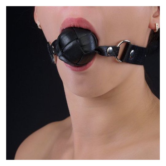 Кляп с шаром, оплетенным натуральной кожей. Ремешок также изготовлен из натуральной кожи. Никелированная пряжка. Размер универсальный. Диаметр шара - 3 см.