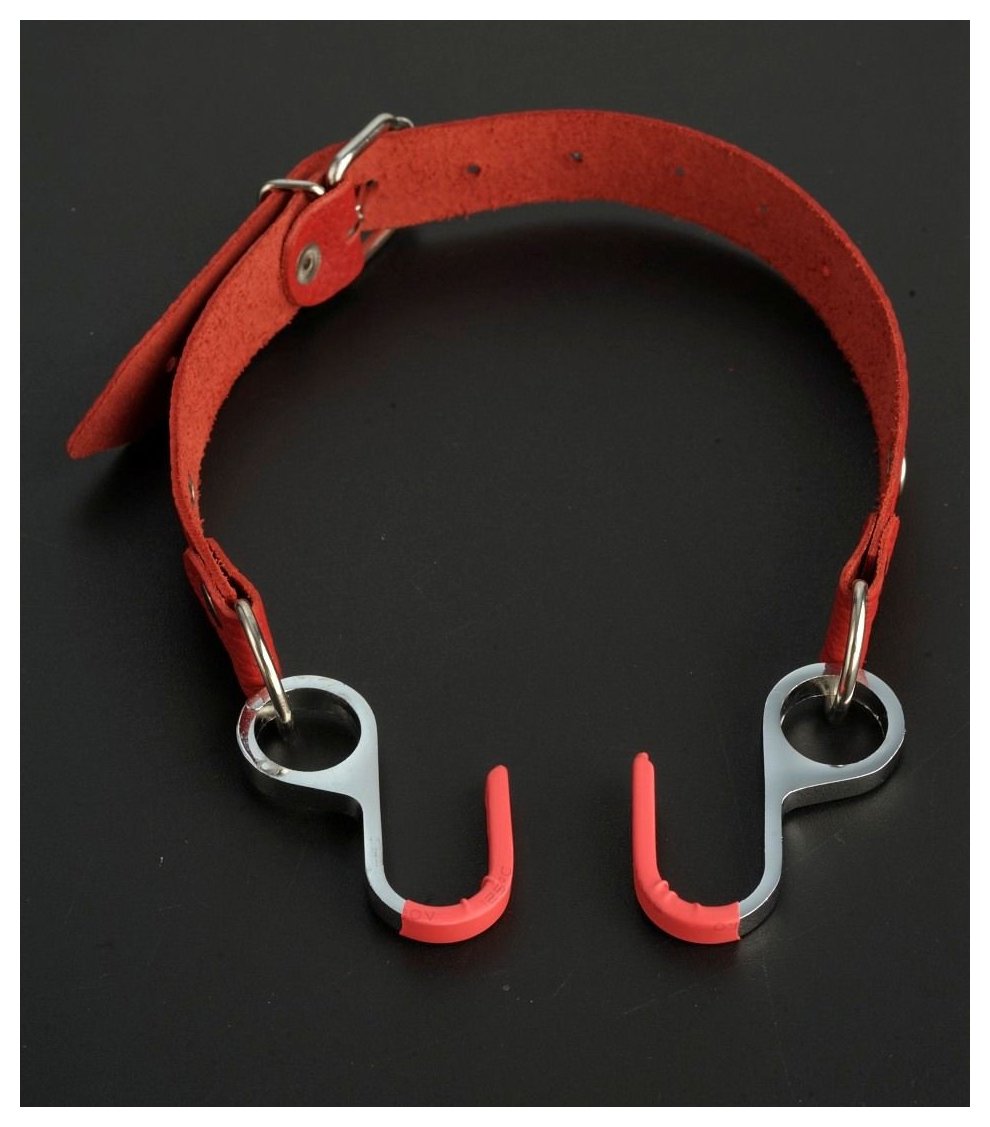 Кляп, который состоит из двух прорезиненных крючков на красном ремешке, способных широко растянуть рот партнеру для воплощения самых сокровенных фантазий. Ремешки удобно и легко регулируются под любой размер головы. Изготовлен из натуральной кожи и никелированной фурнитуры.