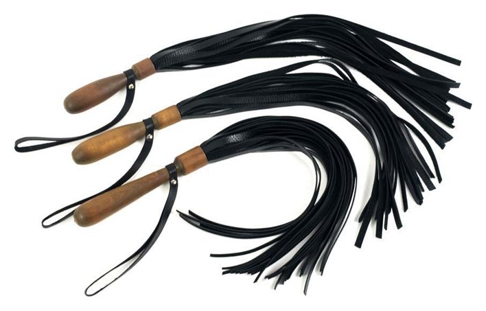 Стильная плетка с кожаными шнурами и удобной деревянной ручкой. На рукояти есть петля. Длина ручки - 19 см.
