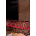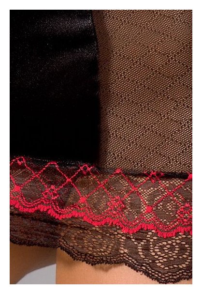 Эта сорочка и игрива, и элегантна одновременно. Строгость ей придают чёрный цвет и классический облегающий фасон на тонких лямочках. А вот двойные полупрозрачные кружева с цветочным узором – красные поверх чёрных – создают дополнительный объем в области бюста и бёдер. Прозрачные вставки с узором в форме ромбов визуально уменьшают объёмы талии и усиливают сексуальность. В комплекте: сорочка, трусики-стринг.