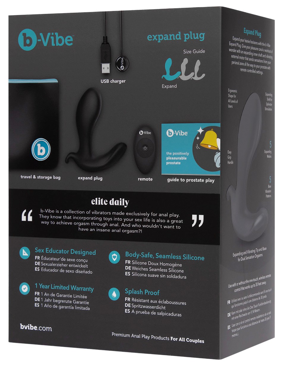 Расширьте свои горизонты с помощью b-Vibe Expand Plug! Подарите себе удовольствие и удивительную тренировку с помощью расширяющегося внутреннего стержня и вибрирующего внешнего мотора, который передает ощущения из перианальной зоны вплоть до простаты. Анальная пробка вибрирует, расширяясь и заполняя все анальное отверстие одним нажатием кнопки. Эта пробка, имеющая 5 уровней расширения и 5 режимов вибрации, предназначена для полного удовлетворения. Эргономичная форма подойдет для любого уровня пользователя. Изогнутый плаг Expand Plug предназначена для прямой стимуляции простаты, предоставляя новичкам прямой путь к наслаждению p-spot, а опытным пользователям - серьезный дизайн, позволяющий им экспериментировать с имеющимися функциями расширения и вибрации. Внутреннее расширение заполняет ваш сфинктер и имитирует ощущение оргазма внутри вас, в то время как внешняя вибрация разогревает ваше тело от перианальной области до простаты. Массажер работает от дистанционного пульта управления или с кнопки в основании игрушки, чтобы регулировать и изменять встроенный функции стимулятора. Время полной зарядки - 2 часа, при этом массажер обеспечивает 1 час беспрерывной работы. Стимулятор сделан из силикона, полностью безопасного для тела.