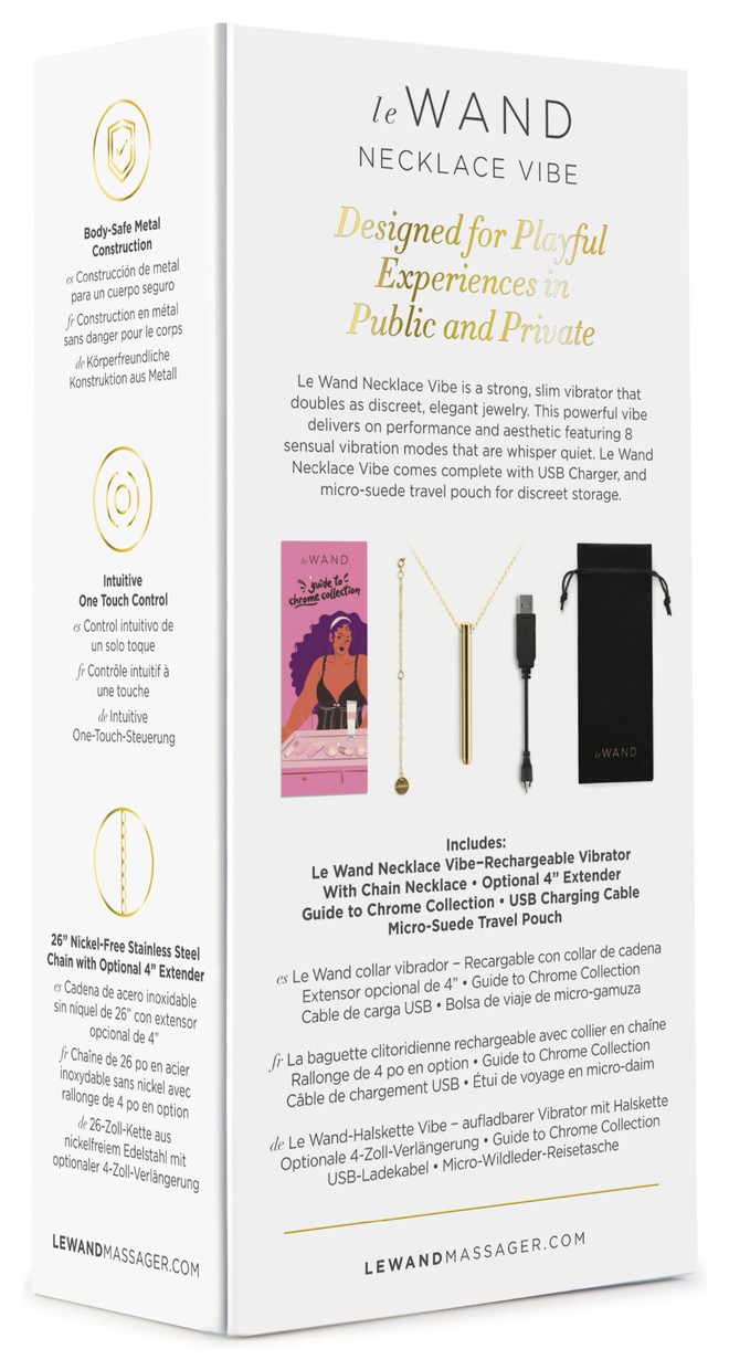 Секс-игрушка, которая также может стать красивым украшением? Да, она существует! И теперь - это сама элегантность и стиль! Наслаждайтесь оргазмами в любое время и в любом месте! Мощный, тонкий вибратор, который одновременно служит сдержанным и элегантным украшением. Закругленный кончик вибростимулятора из стали создан для целенаправленной стимуляции клитора. Вы можете держать насадку прямо над клитором, положить игрушку на всю ширину клитора или вульвы, чтобы охватить большую площадь, или даже перемещать вибратор кругами по клитору. Вы можете легко брать его в путешествие, и ни на одном контроле никто даже и не догадается, для чего можно использовать этот красивый стильный кулон. Благодаря 8 режимам вибрации и сверхтихому мотору он может удовлетворить ваши потребности в любое время и в любом месте. Le Wand ожерелье имеет цепочку из нержавеющей стали, не содержащей никель, с дополнительным удлинителем, а также зарядным устройством USB и дорожным чехлом из микрозамши для хранения подвески-ожерелья. Длина цепочки - 66 см.