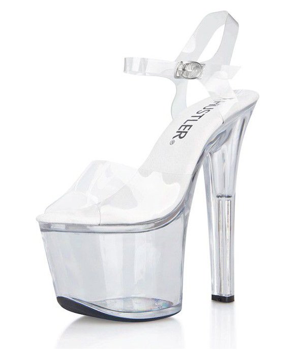 Классические босоножки на высокой прозрачной платформе и шпилькой с металлическим стержнем внутри. Ремешки также прозрачные. Высота платформы - 7 см, высота шпильки - 16,5 см. В комплекте идет пара запасных набоек.