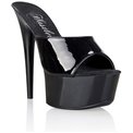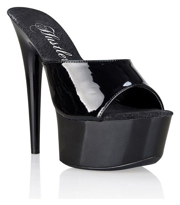 Черные глянцевые сабо с высокой платформой и каблуком-шпилькой. Очень эффектные и крайне удобные для подобной обуви. Высота платформы - 4,5 см, высота каблука - 15 см. В комплекте идет пара запасных набоек.