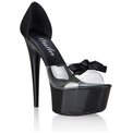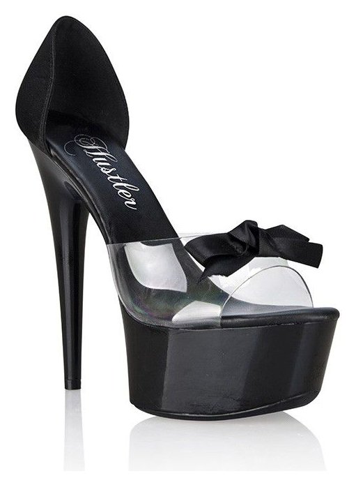 Очаровательные туфельки с прозрачным верхом и черной глянцевой платформой с каблуком шпилькой. Туфельки декорированы бантиком из черного атласа. Высота платформы - 4,5 см, высота каблука - 15 см.