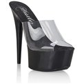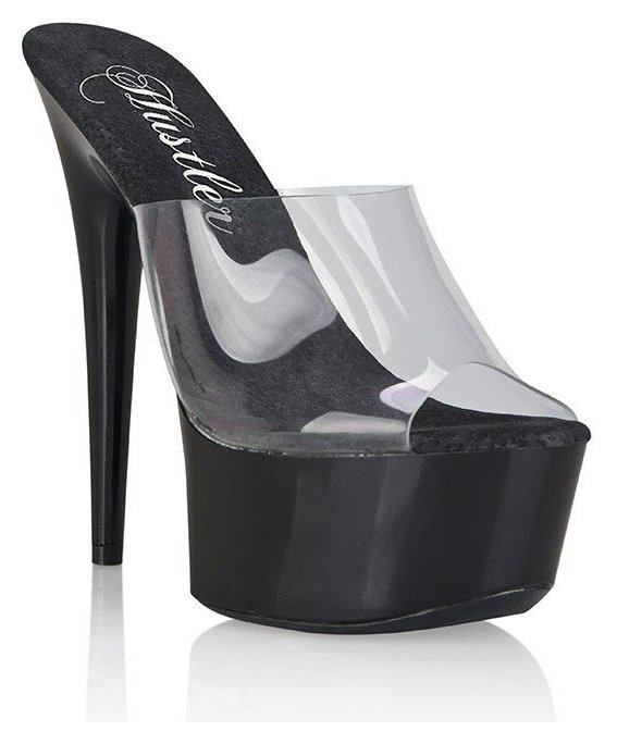 Эффектные сабо с высокой глянцевой платформой черного цвета и каблуком шпилькой. Верхняя прозрачная часть не скрывает изящность ног и отлично фиксирует обувь на них. Высота платформы - 4,5 см, высота каблука - 15 см. В комплекте идет пара запасных набоек.