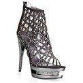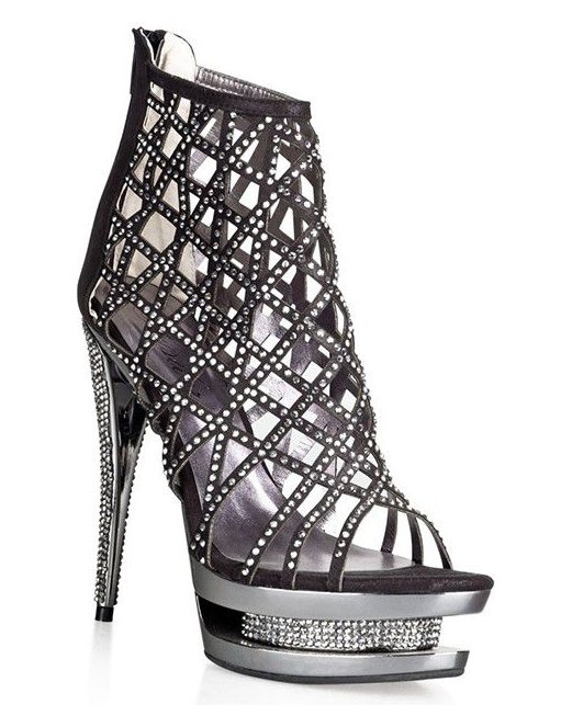 Шикарные туфли-босоножки украшены россыпью кристаллов по всему плетению тонких полосочек, платформа и высокая шпилька декорированы переливающимися стразами. Сзади застегиваются на молнию. Высота платформы - 4 см, высотка каблука - 14 см.