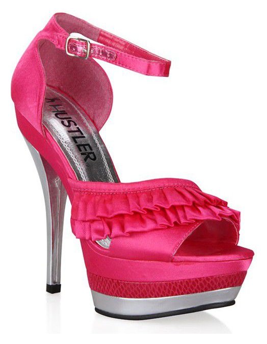 Кокетливые яркие туфельки-босоножки из атласной ткани с элементами искусственной кожи. Босоножки с открытым носком и пышным двойныс слоем рюш на пальчиках. Застегиваются на щиколотке с помощью пряжки. Каблук контрастного серебристого цвета, платформа из трех слоев - серебристая и змеиная искусственная кожа и розовый атлас. Высота платформы - 4,5 см, высота каблука - 15 см.