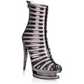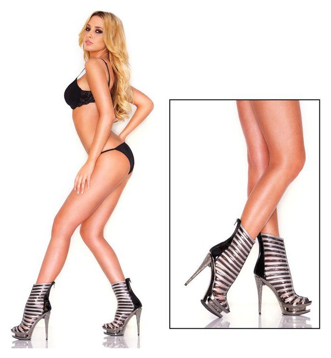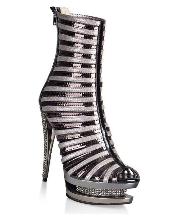 Роскошные ботильоны из комбинированного материала - искусственной кожи и метализированного текстиля. Высокий каблук инкрустирован стразами, небольшая платформа декорирована переливающимися кристалликами. Ботильоны застегиваются сзади на молнию. Высота каблука - 14 см, высота платформы - 4 см.