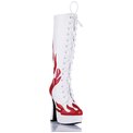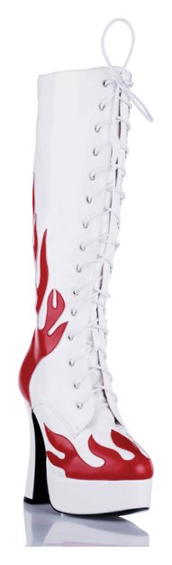 Белые сапоги до колена из лаковой искусственной кожи на высоком устойчивом каблуке. Носок и пятка декорированы красными языками пламени. По всей длине утепленного сапога сзади молния, спереди шнуровка, которая поможет подтянуть сапог по ноге. Высота платформы - 4 см, высота каблука - 12,5 см.