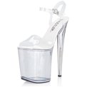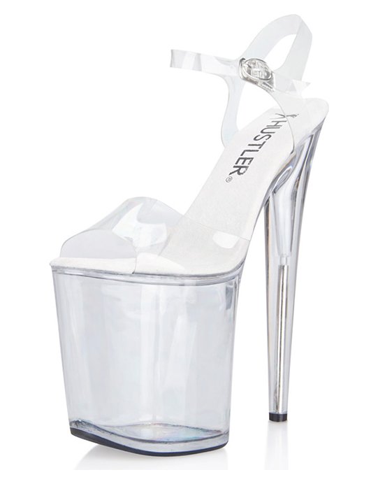 Классические босоножки на высокой прозрачной платформе и шпилькой с металлическим стержнем внутри. Ремешки также прозрачные. Высота платформы - 10 см, высота шпильки - 21 см. В комплекте идет пара запасных набоек.