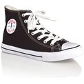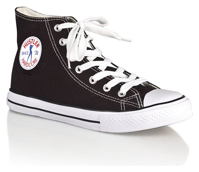 Черные классические кеды из плотного денима. Застегиваются на шнурки белого цвета. Подошва из резины. На язычке, сбоку на щиколотке и сзади на подошве лого Hustler. Внутри стелька из денима. Высота резиновой подошвы - 2,5 см.