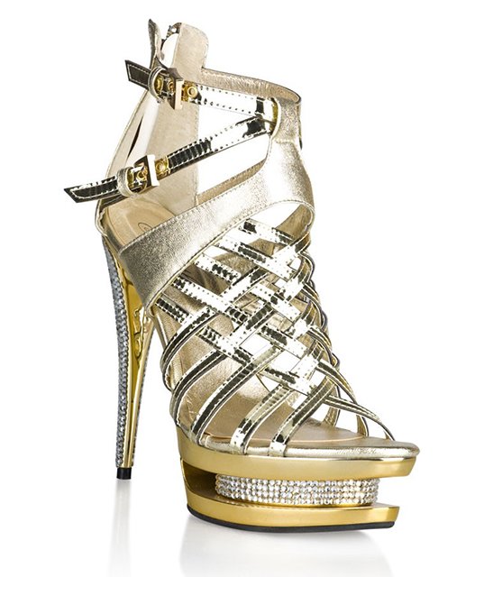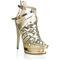 Босоножки глянцевого золотого цвета из искусственной кожи. Застегиваются сзади на молнию, с помощью двух ремешков на щиколотке можно отрегулировать ширину туфелек. Платформа и каблук украшены стразами. Высота платформы - 4 см, высота каблука - 14 см.
