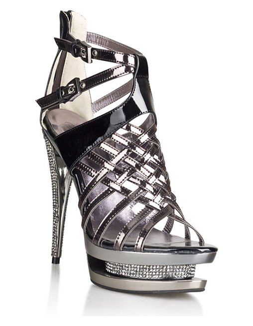 Босоножки глянцевого металлического цвета из искусственной кожи. Застегиваются сзади на молнию, с помощью двух ремешков на щиколотке можно отрегулировать ширину туфелек. Платформа и каблук украшены стразами. Высота платформы - 4 см, высота каблука - 14 см.