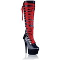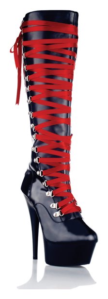 Черные соблазнительные сапожки из лакированной искусственной кожи с шикарной красной атласной шнуровкой. Именно такие сапоги могут стать акцентом в вашем образе! Высота платформы - 4,5 см, высота каблука - 14,5 см.