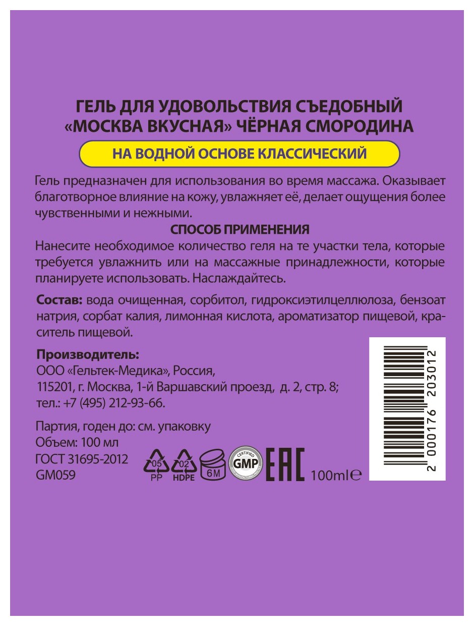 Не просто универсальная смазка, а мега-вкусная смазка, которая сделает из вашего партнера лучший десерт, который хочется целовать, облизывать и посасывать очень долго. Пахнет приятно, на вкус, как спелая черная смородина. Скользит долго, поэтому во время оральных ласк будет всегда влажно, и ничего во рту не пересохнет. После вы можете перейти к массажным ласкам руками или к классическому сексу, смазка подходит и для проникновения тоже. Использовать гель можно с презервативами или секс-игрушками, он универсальный! Во время орального секса вам будет вкусно, а партнеру приятно. А потом поменяйтесь местами! Подарите себе вкусную прелюдию с горячим продолжением. Вкусная смазка с ароматом смородины Для оральных ласк и всех видов любви Дарит нежное и чувственное скольжение Гарантирует удовольствие во время секса Удобный флакон с дозатором Совместима с любыми секс-игрушками и презервативами Без парабенов, глютена, фталат, консервантов и красителей Не липнет и легко смывается обычной водой Не оставляет следов на одежде и белье
