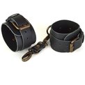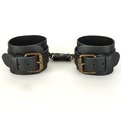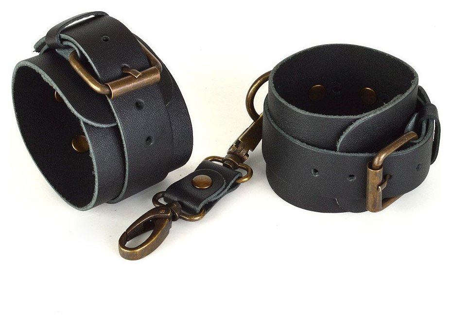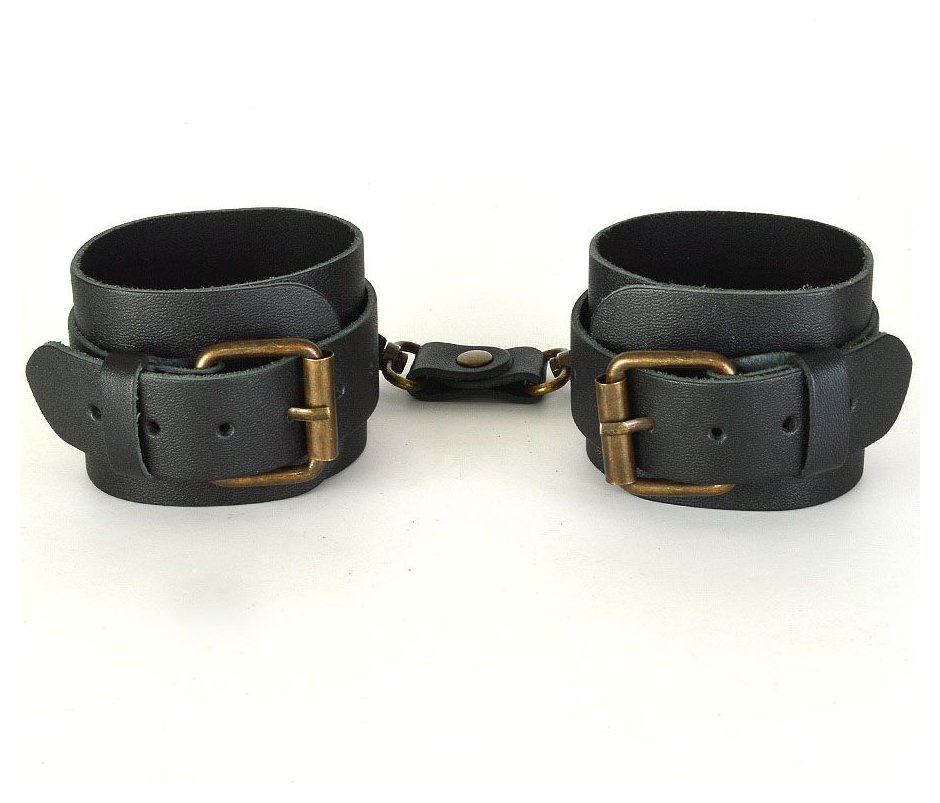 Наручники изготовлены из натуральной кожи черного цвета. Соединяются перемычкой с двумя карабинами. Длина узкого ремешка с пряжкой - 31 см.