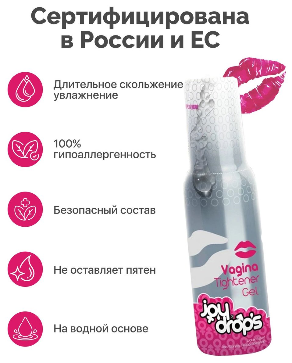 Vagina Tightener Gel - интимный гель для сужения влагалища, сертифицированный в России и ЕС. Гель восстанавливает структуру тканей вагины. Особо эффективен для устранения послеродовых изменений. Обеспечивает устойчивый эффект при регулярном использовании уже через месяц. Рекомендуется использование совместно с тренажерами мышц влагалища (приобретается отдельно). Регулярное использование улучшит сужающий эффект. Обеспечивает долгосрочный эффект: при разовом использовании эффект от 30 минут до 1,5 часов в зависимости от индивидуальных особенностей. При регулярном использовании эффект закрепляется: происходит восстановление структуры мышц влагалища, процедура сравнима с косметологическим лифтингом. Гипоаллергенен и совместим с презервативами.