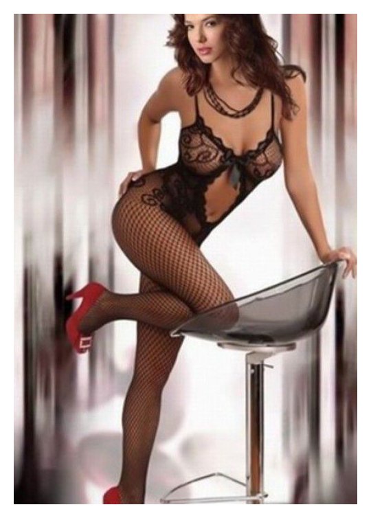 Комбинезон в сетку с кружевными узорами, вырезом-капелькой и бантом на лифе.