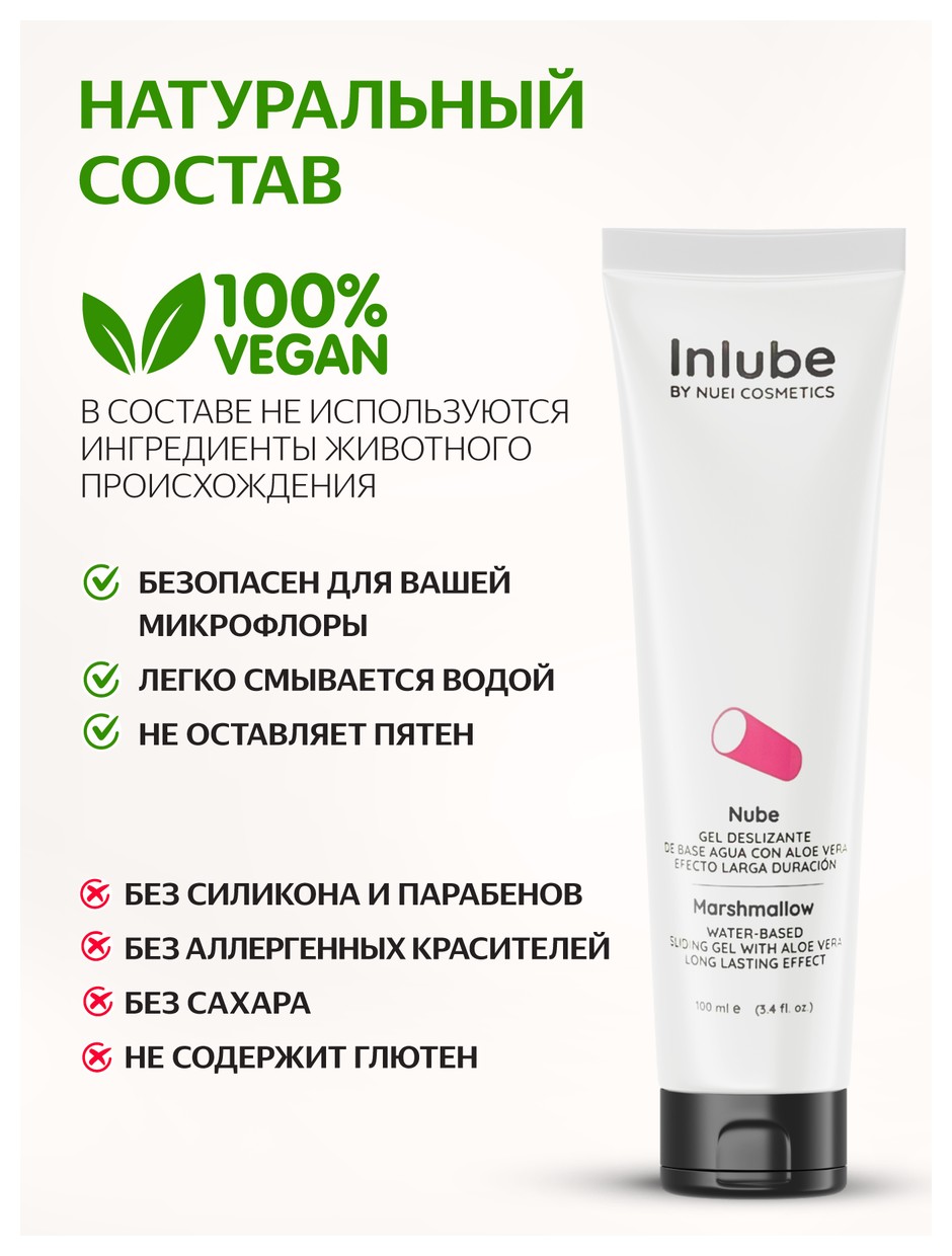 Inlube - интимный лубрикант на водной основе с гелевой текстурой обеспечивает максимально длительное скольжение и естественные ощущения. Роскошное шелковистое прикосновение и эксклюзивная формула гелей Inlube удивят вас своим длительным эффектом. Лубрикант содержит в своем составе алоэ вера, которое оказывает смягчающее и успокаивающее действие для лучшего ухода за интимными зонами. А также обладает интенсивным и соблазнительным ароматом зефира, не оставляющим послевкусия. Веганская формула на водной основе не содержит парабенов, сахара и глютена.