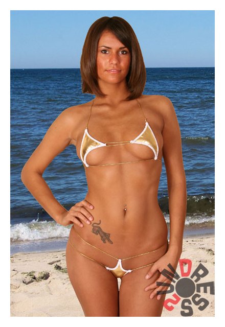 Если надеть этот экстремальный золотой купальник, то при ярком солнце окружающим будет казаться, словно самые нежные участки тела охвачены огнем. Не смотря на всю смелость наряда, маленькие кусочки ткани закрывают всё то, что не предназначено для посторонних глаз – сексуально и в рамках приличий одновременно.
