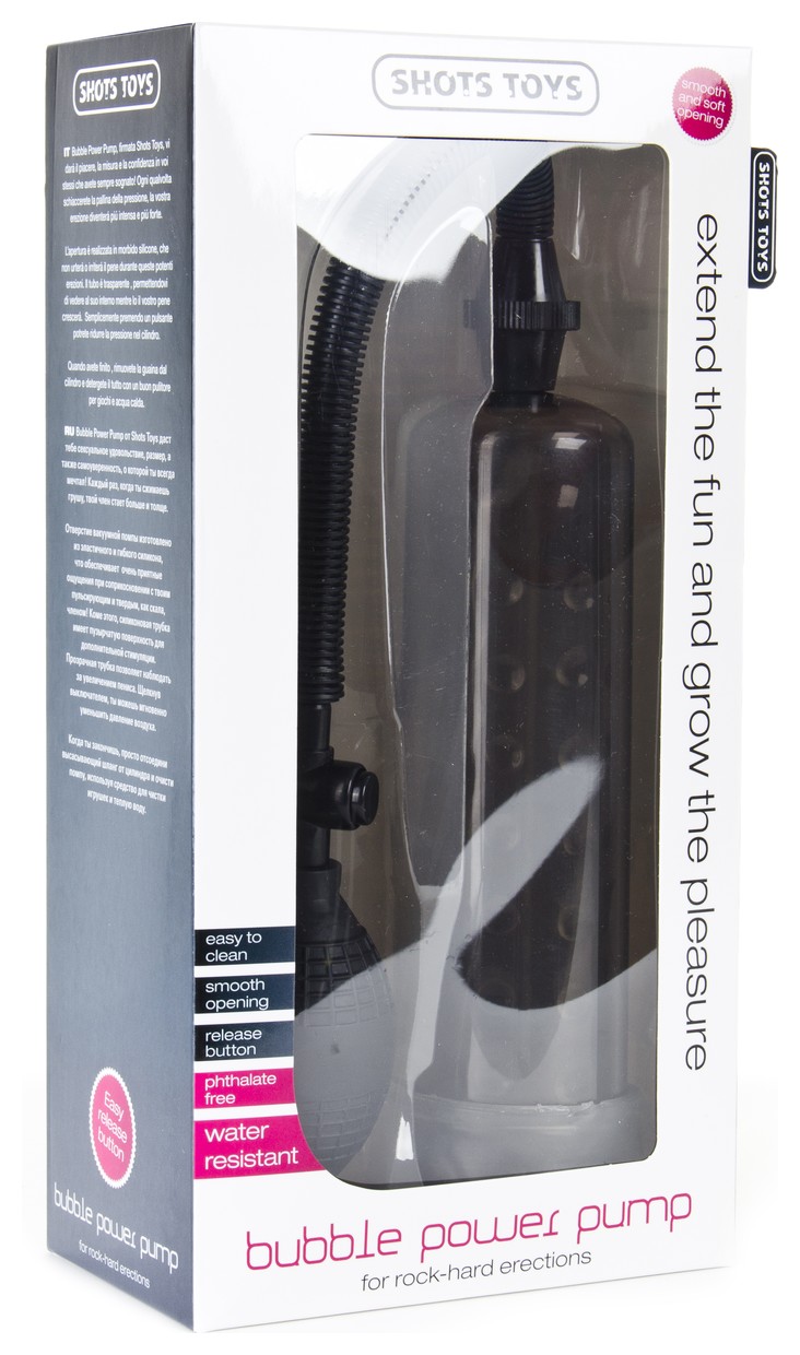 Bubble Power Pump от Shots Toys даст тебе сексуальное удовольствие, размер, а также самоуверенность, о которой ты всегда мечтал! Каждый раз, когда ты сжимаешь грушу, твой член становится больше и толще. Отверстие вакуумной помпы изготовлено из эластичного и гибкого силикона, что обеспечивает очень приятные ощущения при соприкосновении с твоим пульсирующим и твердым, как скала, членом! Коме этого, силиконовая трубка имеет пузырчатую поверхность для дополнительной стимуляции. Прозрачная трубка позволяет наблюдать за увеличением пениса. Щелкнув выключателем, ты можешь мгновенно уменьшить давление воздуха. Когда ты закончишь, просто отсоедини высасывающий шланг от цилиндра и очисти помпу, используя средство для чистки игрушек и теплую воду. Рабочая длина 19 см. рабочая длина 19 см