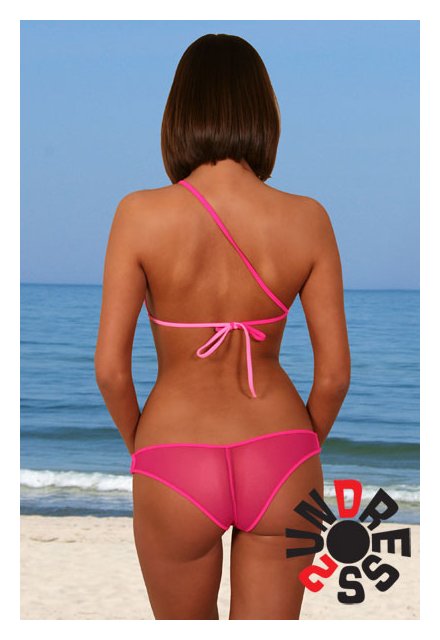 Этот роскошный прозрачный купальник, состоящий из двух частей, призван покорять и завоевывать. Необычный по форме топ с одной лямочкой плавно переходит в трусики с пикантными вырезами по бокам. О, если бы красота могла убивать, то на пляже после появлении девушки в этом великолепии не осталось бы ни одной живой души.