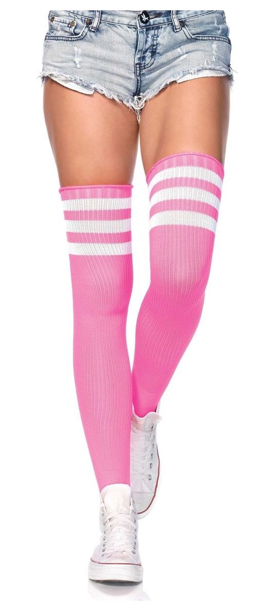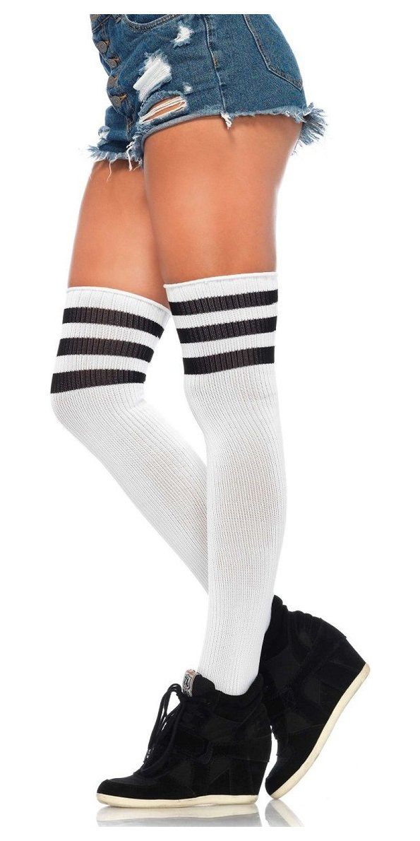 Примеряйте на себя роль спортивной девушки – мужчину любят подтянутых обладательниц стройных ног. В ваших силах подчеркнуть их красоту с помощью этих чулок! Чулочки спортивного типа выполнены из мягкой ткани белого цвета и украшены красной и синими полосками. За счет эластичной вязки чулки хорошо держатся на ножках без пояса.