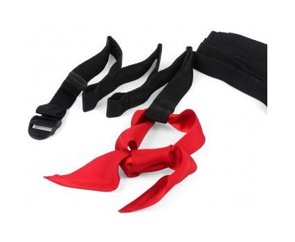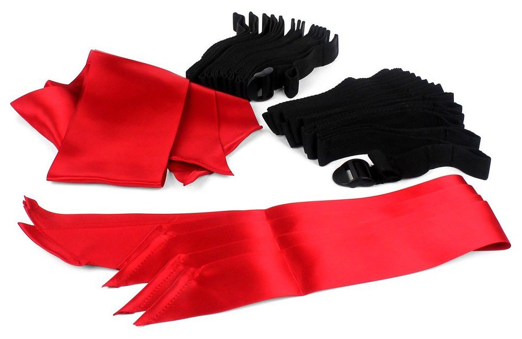 Если привычный секс больше не будоражит вашу фантазию, если вы жаждете острых ощущений и не против испробовать атрибутику садо-мазо, вам обязательно понравится эта новая игрушка. Больше никакого секса за закрытой дверью — набор поясов-фиксаторов поможет вам максимально раскрепоститься и предаться безудержным сексуальным играм. Вы сможете зафиксировать партнершу в дверном проеме и заставить ее умолять о пощаде. Эластичные многофункциональные ремни откроют перед вами широкие возможности, никаких ограничений в выборе позы. Сочетание черных и красных полос, их скрещивание на запястьях и лодыжках без сомнения пробудят в вас страсть и желание. Система поясов фиксаторов может быть подвешена в проеме любой межкомнатной двери. Установка не требует специальных знаний и применения дополнительных приспособлений. Как правило, в дверях фиксируется партнерша, однако конструктивные особенности набора не ограничивают полет ваших эротических фантазий. В комплект входят: -2 ремня с петлями для закрепления в дверном проеме (длина каждого — 488 см) -4 шелковых фиксатора для лодыжек и запястий (длина каждого — 71 см) -1 шелковистый пояс для завязывания глаз (длина составляет 127 см).