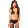 Очаровательный комплект белья, способный создать для вас нежный и страстный образ настоящей обольстительницы. Бюстгальтер без чашечек и широкий пояс с подтяжками для чулок полностью выполнены из кружева. Красивый узор, будто мороз на стекле, теперь будет на вашем теле. В комплекте также есть непрозрачные стринги и цепочка на шею, которая свободно свисает до самого животика. Её в качестве украшения можно надевать и с другими нарядами. В комплекте: лиф, пояс, трусики-стринги, цепочка.