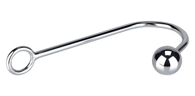Анальный крюк из стали с круглым шаром на конце. Анальный крюк - девайс не для новичков, а для имеющих опыт в искусстве бандажа. При первом использовании анального крюка рекомендуется использовать наиболее простые техники связывания. С этим крюком можно использовать любые виды веревок - хлопковые или синтетические. Длина вводимой части - около 10 см. Диаметр шара - 3,6 см, остальная часть крюка составляет 22 см вместе с кольцом. Диаметр кольца для продевания веревки - 3 см.