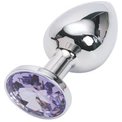 Серебристая анальная пробка среднего размера с сиреневым кристаллом.