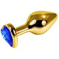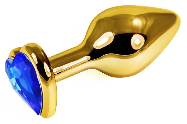 Золотистая анальная пробка с синим кристаллом-сердечком - 7,6 см