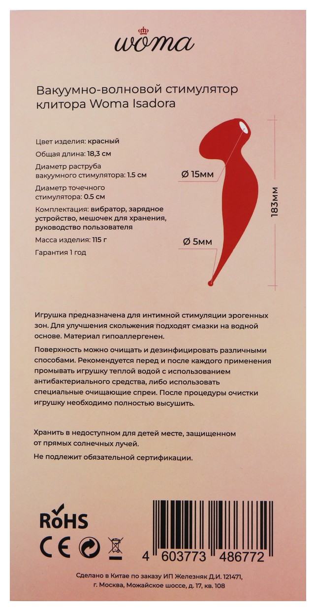 Isadora – оригинальный вакуумно-волновой стимулятор с вибрацией, внешний вид которого напоминает колибри. Isadora сочетает в себе два типа стимуляции: вакуумно-волновую и вибрацию. Стимуляторы расположены на разных концах игрушки и работают только по отдельности. Когда вы включаете вибрацию, волновая стимуляция выключается, и наоборот. Isadora приятно держать в руке, его округлая форма не позволяет игрушке выскальзывать даже на самом мощном режиме вибрации. Игрушка создана с учётом анатомии: диаметр раструба вакуумного стимулятора клитора – 1.5 см, что подходит для большинства женщин. Вакуумно-волновой стимулятор имеет 7 разных режимов работы. Им можно воздействовать не только на клитор, но и на область вокруг него и даже на соски. Вибратор Isadora также имеет 7 режимов, чтобы вы могли выбрать то, что понравится именно вам. Точечный вибратор многофункционален – им можно стимулировать самые разные эрогенные зоны на своем теле или теле партнера. Играть с Isadora можно даже в душе, главное – не погружать её в воду полностью. Управлять Isadora очень просто, на корпусе игрушки всего три кнопки: кнопка питания и кнопки управления стимуляторами. Чтобы включить Isadora, нажмите и удерживайте в течение двух секунд кнопку питания (средняя). Виброотклик и световая индикация подскажут, что игрушка перешла в режим ожидания. Чтобы включить вакуумно-волновой стимулятор и переключать режимы его работы, коротко нажимайте на кнопку управления режимом (кнопка с губками). Чтобы включить точечный вибратор и переключать режимы его работы, коротко нажимайте на кнопку управления режимом (кнопка с волной). Чтобы выключить игрушку, снова нажмите и удерживайте кнопку питания.