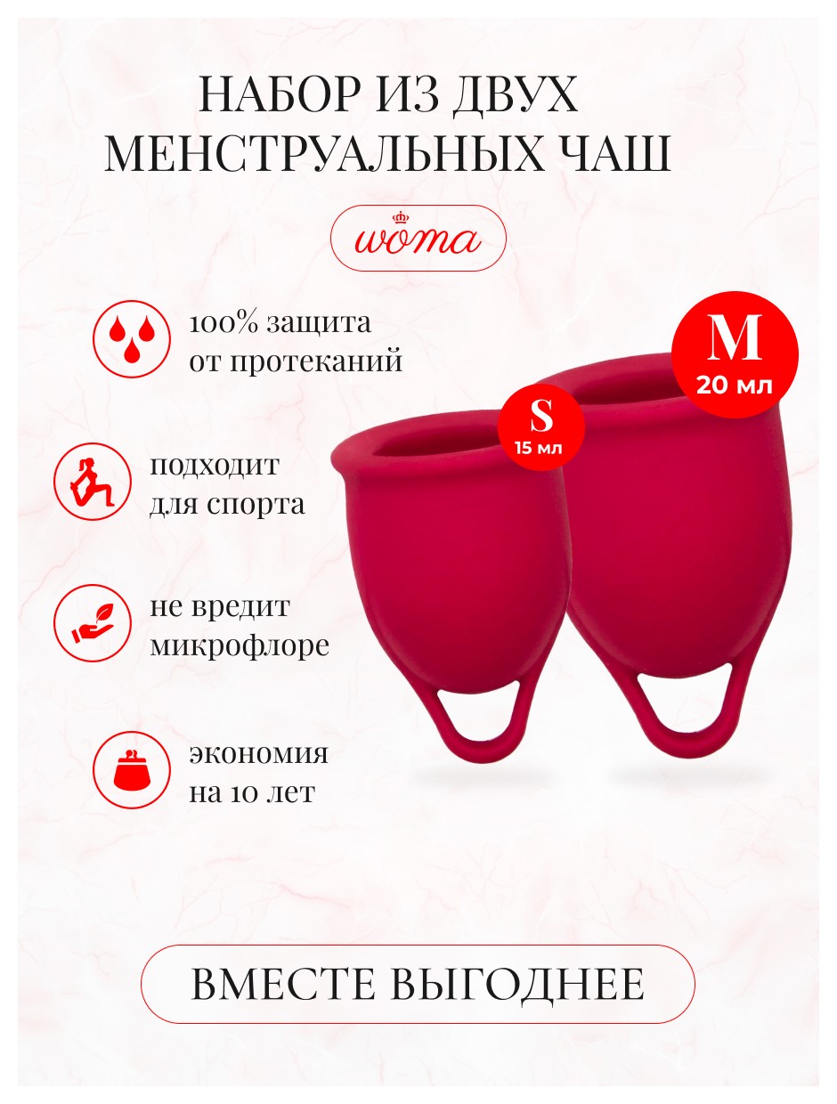Woma Iona выполнены из мягкого медицинского силикона, они безопасны для здоровья и очень гигиеничны. Чаши удобно размещаются внутри и не вызывают никакого дискомфорта. При этом что бы вы не делали и чем бы не занимались (отдых, активный спорт и проч.), чаша всегда останется на месте и будет надежно защищать от протекания. Она абсолютно незаметна под любым бельем и не ощущается внутри. Менструальная чаша не впитывает выделения во время менструального цикла и предназначена для их сбора. Благодаря этому она безвредна для естественной микрофлоры и подходит для многоразового использования. При помощи удобной петельки снизу можно комфортно извлечь чашу после использования. Важно подобрать свой размер - именно поэтому чаши Woma Iona производятся в двух размерах (S=15 мл и M=20 мл), чтобы вы наверняка смогли подобрать нужный именно вам размер. Кроме того, это очень экологично - используя чашу вы перестаете загрязнять планету тампонами и прокладками. А если посчитать сколько денег вы тратите на эти предметы гигиены в год, то вы увидите явное преимущество использования менструальных чаш. Менструальная чаша — единственное средство женской гигиены, которое позволяет отслеживать объемы кровопотери. Средняя кровопотеря в сутки составляет 50-70 мл (в норме до 80 мл), а кровопотеря за один менструальный цикл — не более 250 мл. Зная объем менструальной чаши, можно легко сравнить объемы потерянной крови с нормой и держать свое здоровье под контролем. Объем чаш - 15 и 20 мл. Длина малой чаши - 5,7 см, диаметр - 3,8 см. Длина большой чаши - 6 см, диаметр - 4,1 см.