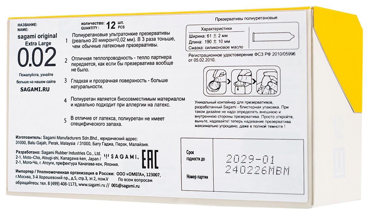 Спустя многие годы разработок и внедрения новых технологий команда Sagami представила первую за всю 90-летнюю историю компании модель XL размера. Ширина модели составляет 61 мм. Полиуретановые презервативы Sagami Original 002 увеличенного размера для ярких и естественных удовольствий. Полиуретановые ультратонкие презервативы (24 микрон = 0,02 мм). В 3 раза тоньше, чем обычные латексные презервативы. Отличная теплопроводность - тепло партнера передается, как если бы презерватива вообще не было. Полиуретан идеально подходит в случае аллергии на латекс и не имеет специфического запаха. Толщина стенки - 0,02 мм. Номинальная ширина - 61 /-2 мм. В упаковке - 12 шт. - Регистрационное удостоверение РФ: ФСЗ 2010/05996 - Дата регистрации медицинского изделия: 05.02.2010 г. - Срок действия регистрационного удостоверения: бессрочно - Представитель изготовителя медицинского изделия: - - Номер модели: 69667