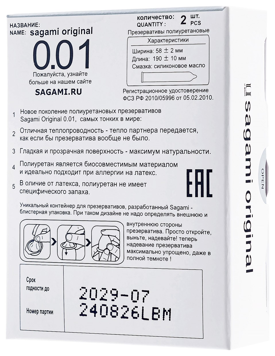 Эти ультратонкие презервативы с толщиной стенки 0,01 мм созданы специально для мужчин с выдающимися достоинствами. Благодаря увеличенному диаметру и длине в них вы всегда будете чувствовать себя комфортно. Не нужно беспокоиться о соскальзывании, ЗППП, нежелательной беременности партнёрши… Sagami Original L-size – комфорт, защита и естественные ощущения для по-настоящему больших мальчиков. Толщина стенки - 0,01 мм. Номинальная ширина - 58 /-2 мм. В упаковке - 2 шт. - Регистрационное удостоверение РФ: ФСЗ 2010/05996 - Дата регистрации медицинского изделия: 05.02.2010 г. - Срок действия регистрационного удостоверения: бессрочно - Представитель изготовителя медицинского изделия: - - Номер модели: 69667