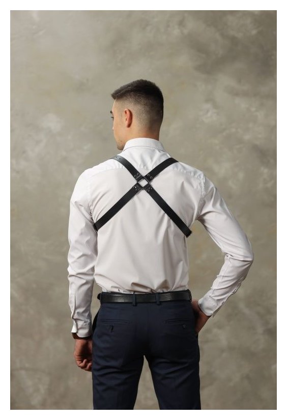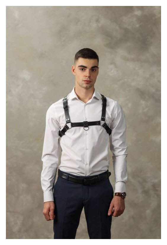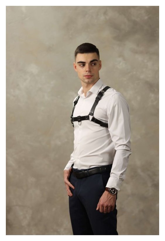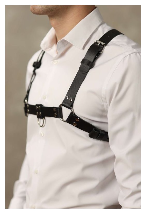 Стильная и необычная мужская портупея, полностью выполненная из натуральной кожи. Декорирована качественной металлической фурнитурой. Аксессуар двусторонний: его можно носить по разному, меняя положение по Вашему желанию. Стильный элемент для Вашего образа, который будет особенно эффектно смотреться на обнаженном мужском теле и возбуждать фантазию!