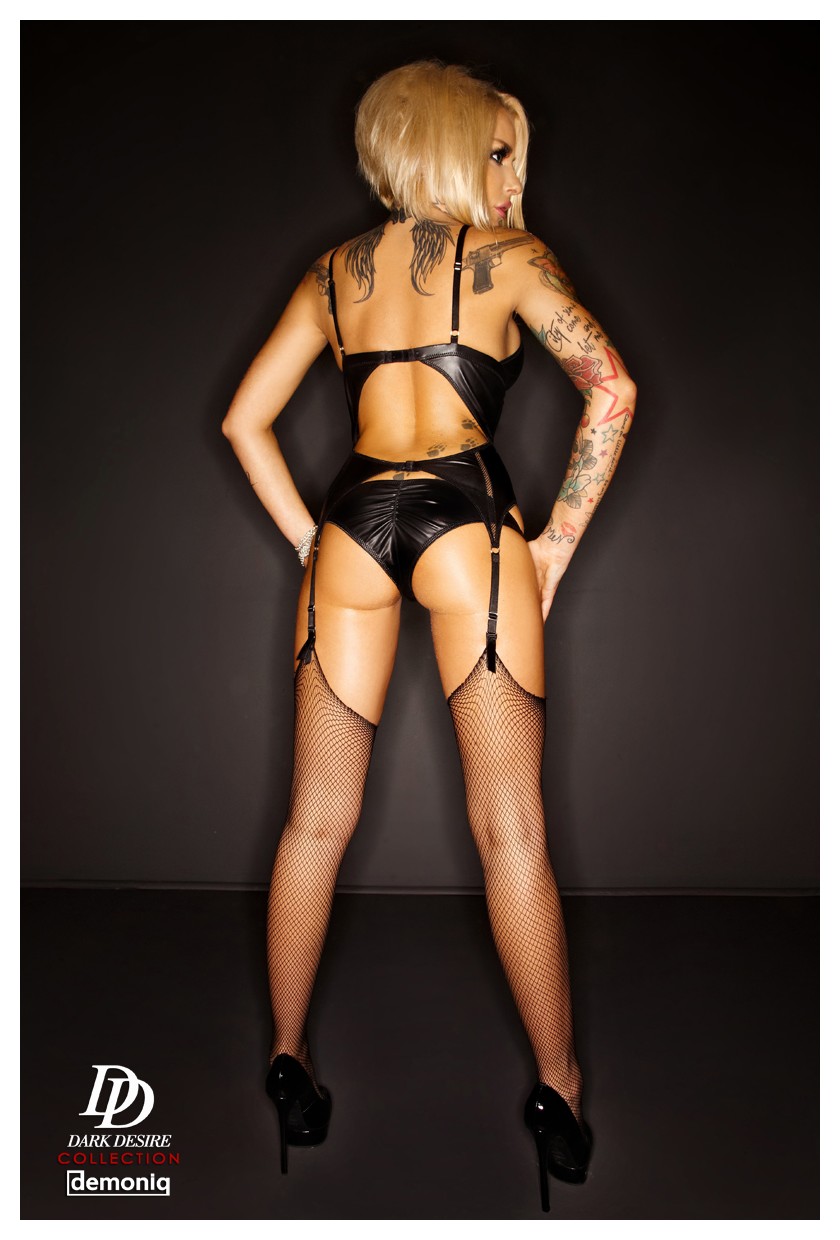 Комплект Elvire поможет стать Вам более элегантной, утонченной и полной чувственной страсти. Elvire сочетает в себе: привлекательный дизайн, высококачественные материалы, комфорт при ношении и металлические серебристые детали. Это лучшее предложение для Вас, если Вы хотите подчеркнуть свой страстный характер привлекательным и изысканным бельем. Корсаж и трусики сделаны из эластичного матового материала под «кожу» - максимально комфортного для тела и приятного на ощупь. Черный цвет ткани прекрасно сочетается с серебристыми кольцами. Отдельное внимание стоит уделить металлическим деталям: они не окисляются и не оставляют следов ни на теле, ни на изделии после стирки. Все детали сделаны не только качественно, но и соответствуют стилистике всего комплекта. Форма корсажа и вертикальные полоски из черной сетки стройнят фигуру, подчеркивая её преимущества, а правильное декольте визуально увеличивает грудь. Комплект Elvire привлекателен с обеих сторон: сзади вырез корсета показывает спину и форму ягодиц, а вертикальные складки заставляют обратить внимание на Ваши сексуальные бедра и ягодицы. Комплект также включает в себя ажурные чулки с декоративной лентой. В комплекте: корсаж, трусики, чулки.