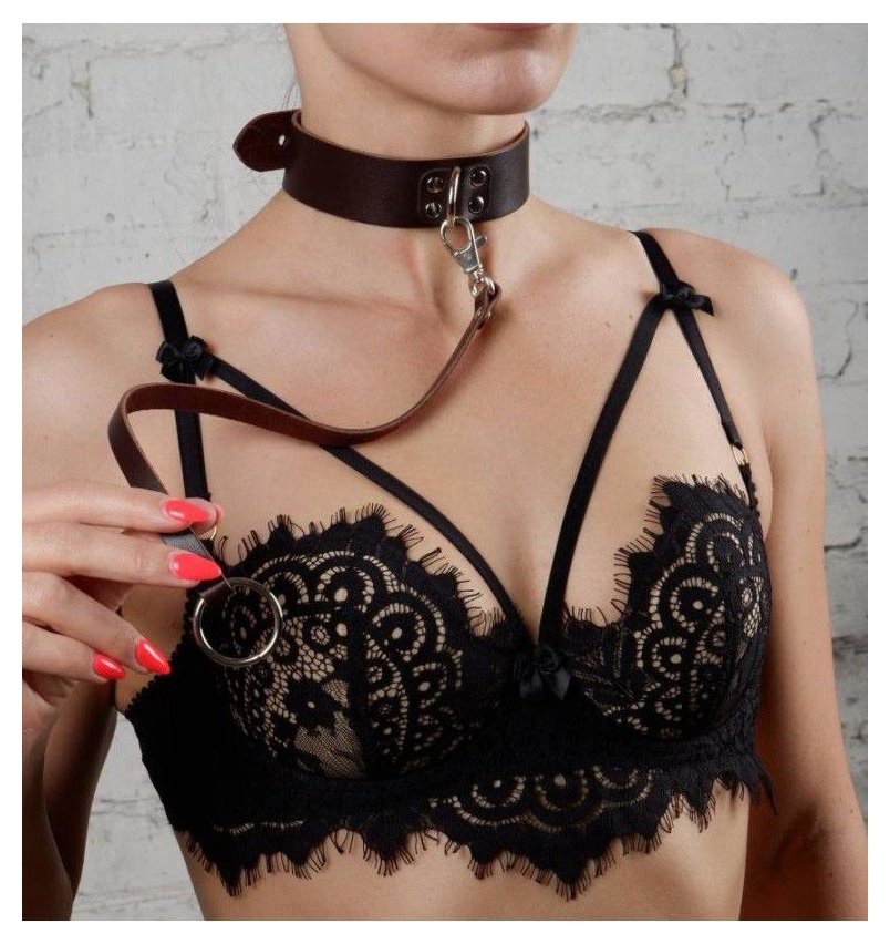 Ошейник изготовлен из натуральной кожи цвета шоколад. Поводок в виде кожаной ленты с карабином с одной стороны и колечком с другой. Регулируется при помощи пряжки.