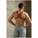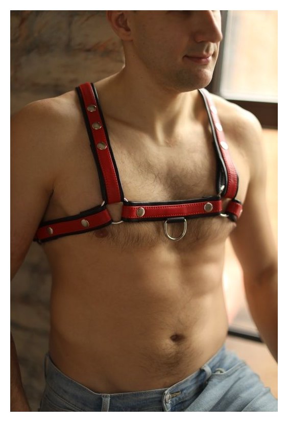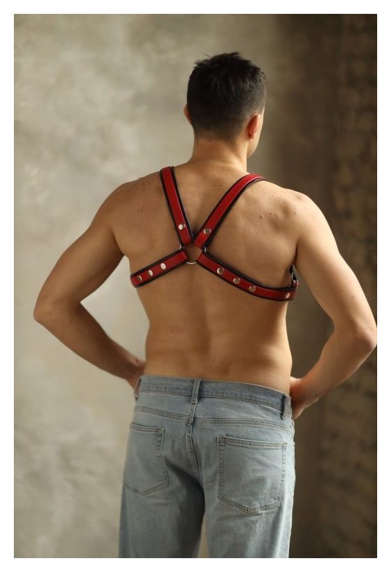 Яркая и стильная, очень качественная мужская портупея, полностью выполненная из натуральной кожи. Лицевая часть выполнена из красной кожи, а подклад - из черной, очень мягкой и приятной к телу. Фиксация происходит с помощью кнопок, что позволяет легко и удобно регулировать посадку аксессуара по фигуре. Портупея декорирована надежными сварными металлическими кольцами, к которым можно при желании пристегивать дополнительные аксессуары и комбинировать в разных вариантах. Портупея двусторонняя: ее можно носить по разному, меняя положение.