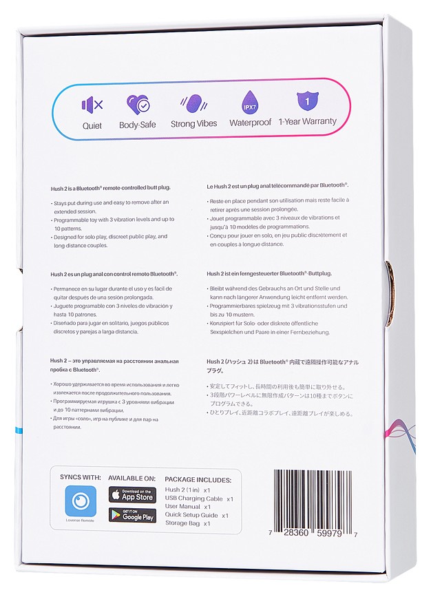 Размер XS идеально подойдет для начинающих путешественников в мир анального удовольствия. Полностью гладкое и бесшовное покрытие из медицинского силикона идеально подходит даже для длительного ношения. Шелковистый материал и плавная форма обеспечивают комфортное введение. Узкая ножка и широкий ограничитель гарантируют безопасность использования. Водонепроницаемая игрушка Lovense Hush 2 обладает мощным мотором и глубокой низкочастотной вибрацией. Сильные и приятные вибрации помогают достичь небывалого наслаждения как в соло игре, так и в прелюдии с партнером. В вашем распоряжении три уровня мощности и четыре предустановленных режима вибрации, управляемых кнопками в основании девайса. Кроме того, игровые возможности не ограничены с приложением Lovense Remote. Установить на смартфон и использовать игрушку дистанционно легко, даже находясь на расстоянии с партнером. Варианты создания собственных ритмов вибрации, реагирующих на музыкальный плейлист или голос — все это доступно с инновационной технологией управления по Bluetooth Lovense. Настраивайте уровни мощности вибрации по своему вкусу и сохраняйте их для дальнейшего использования. Также запрограммируйте до 10 любимых паттернов и обеспечьте себе сверхсильные оргазмы! Рекомендуется использовать со смазкой на водной основе.
