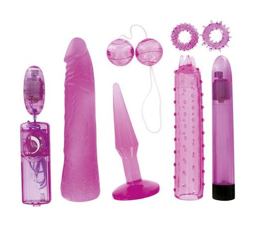 Фиолетовый вибронабор BESTSELLER EROTIC TREASURE KIT. Состоит из классического вибратора, анального плага, виброяйца, 2 эрекционных колец, 2 эластичных насадок. Длина вибратора - 17 см, диаметр - 2,5 см. Длина фаллической насадки - 19 см., диаметр - 3,5 см. Длина насадки с шипами - 17 см., диаметр - 3,2 см. Длина анальной пробки - 14,5 см., диаметр - 2,8 см. Длина виброяйца - 5,5 см., диаметр - 2,5 см.