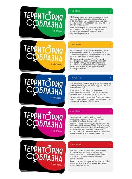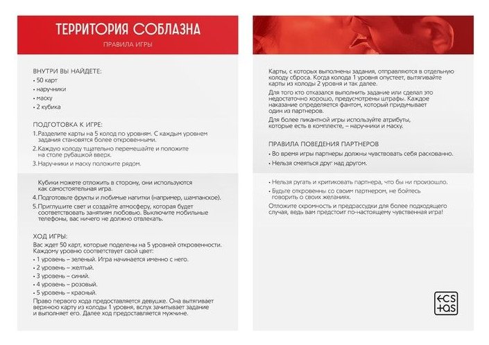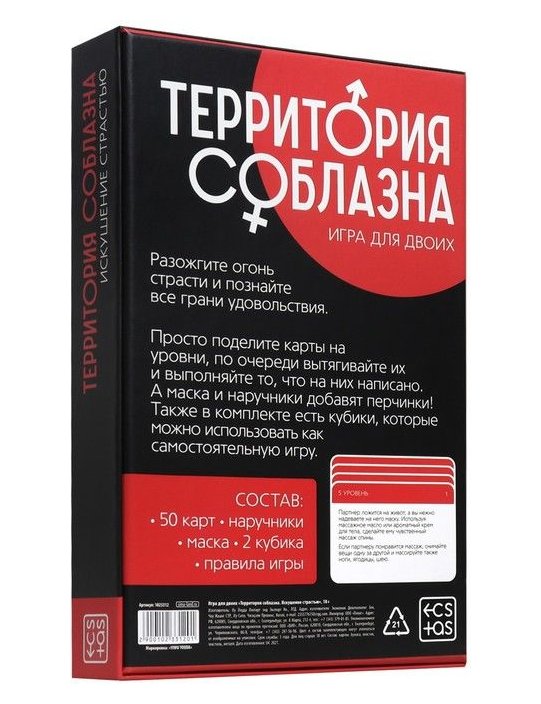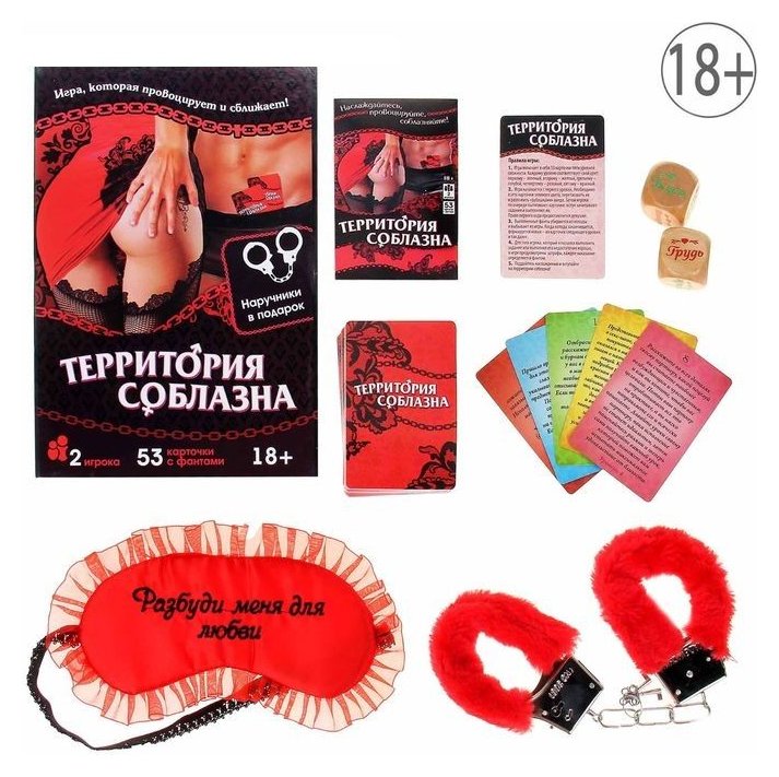 «Территория соблазна» – это серия эротических игр для двоих, в основе которой лежит акцент на раскрепощения. Разговоры, лёгкие прикосновения, пикантные фанты, прелюдия к сексу и постепенный переход к самому главному – сексу. Серия включает в себя наборы с аксессуарами, карточные игры, наборы кубиков и т.д. Как пользоваться набором? Разделите карты на 5 колод по уровням. Помните, что с каждым уровнем задания становятся всё более откровенными. Приглушите свет и создайте атмосферу, которая будет соответствовать занятиям любовью. Выключите мобильные телефоны, вас ничего не должно отвлекать. По очереди вытягивайте карты сначала 1 уровня, зачитывайте задания и выполняйте его. когда колода 1 уровня опустеет, переходите к 2 уровню, и так далее. Для того кто отказался выполнить задание или сделал это недостаточно хорошо, предусмотрены штрафы. Для более пикантной игры используйте аксессуары, которые есть в комплекте, – наручники и маску. В комплекте: 50 карт, наручники, маска, 2 пластиковых кубика.