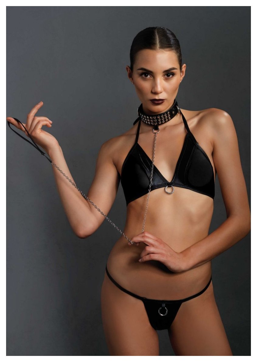 Стильный ошейник из эко-кожи, декорированный металлическими заклёпками. Имеет несъёмный металлический поводок с удобной петлёй для руки. Внимание:белье на модели в комплект не входит!