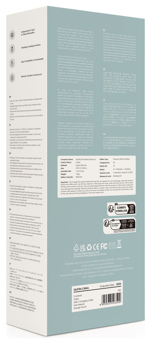 Позвольте вашему интимному удовольствию каждый раз принимать новую форму с Chika, гибким вибратором-кроликом от SVAKOM, управляемым через приложение. Chika имеет мягкую головку, которая прижимается к точке G, где бы она ни была, и независимый стимулятор клитора, все они изготовлены из мягкого жидкого силикона. Попробуйте вибрацию в 5 режимах, 5 уровнях интенсивности (25 вариантов и больше) и бонусном интеллектуальном режиме, который имитирует ритм секса в течение 4 минут. Включите функцию нагрева и почувствуйте, как температура головки Chika достигает 38°C, чувствуете, как это усиливает ваше возбуждение? Чтобы получить доступ к дополнительным настройкам, включая управление на расстоянии и игру с партнером, просто используйте Chika с приложением SVAKOM на смартфоне. Разработанный для удобства, вибратор Chika оснащен функцией памяти, которая возобновляет работу в последнем использованном режиме вибрации, travel блокировкой для предотвращения случайного включения, индикатором заряда батареи USB-портом type С для зарядки с пылезащитной крышкой. Chika также водонепроницаема, ее можно использовать в ванне или душе и легко мыть. Рабочая длина - 11,8 см.