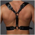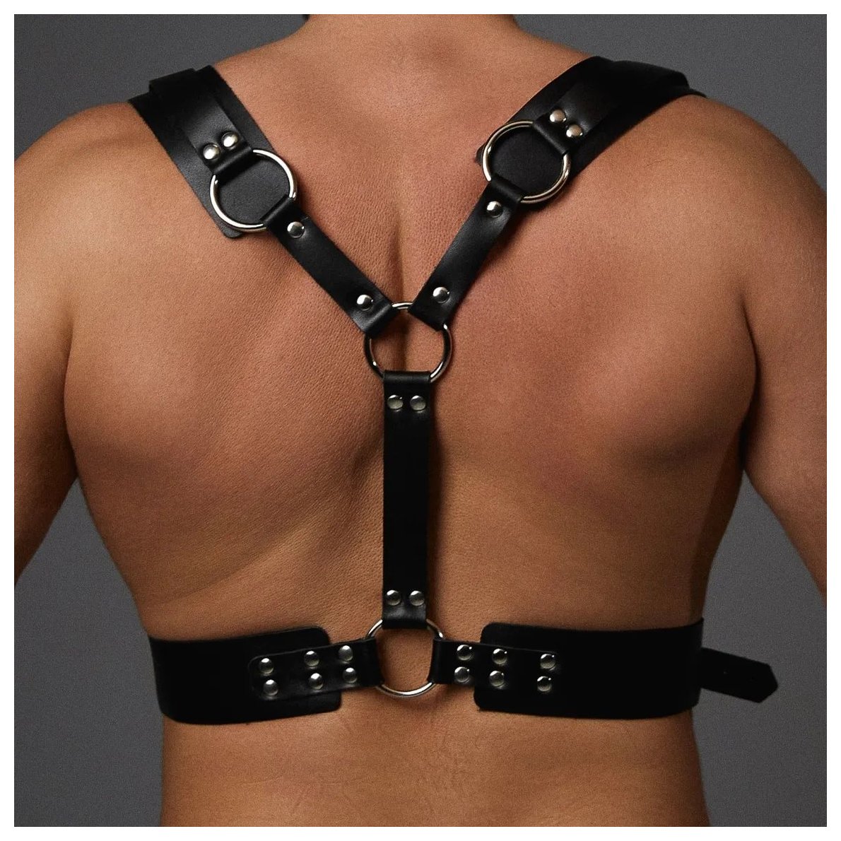 Черная кожаная мужская портупея с регулируемыми ремешками. На спинке красивое Y-образное соединение кольцами.