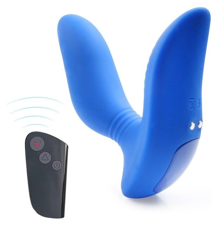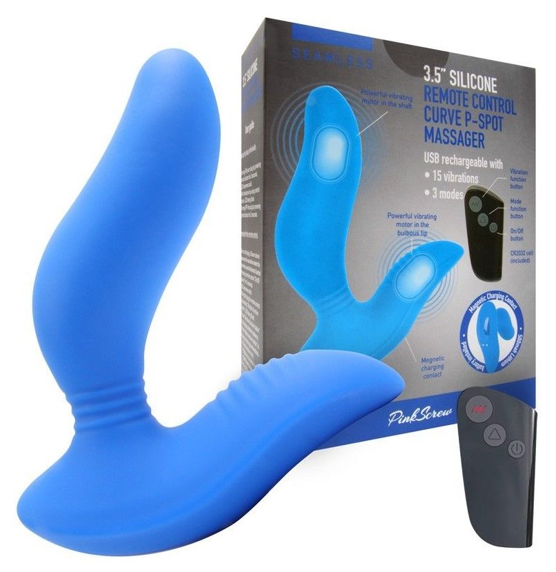 Синий вибромассажер простаты 3,5’’ Remote Control Curve P-spot Massager. 15 режимов вибрации. Два виброэлемента - в стволе и в основании. Дистанционный пульт управления. Рабочая длина - 10,5 см.