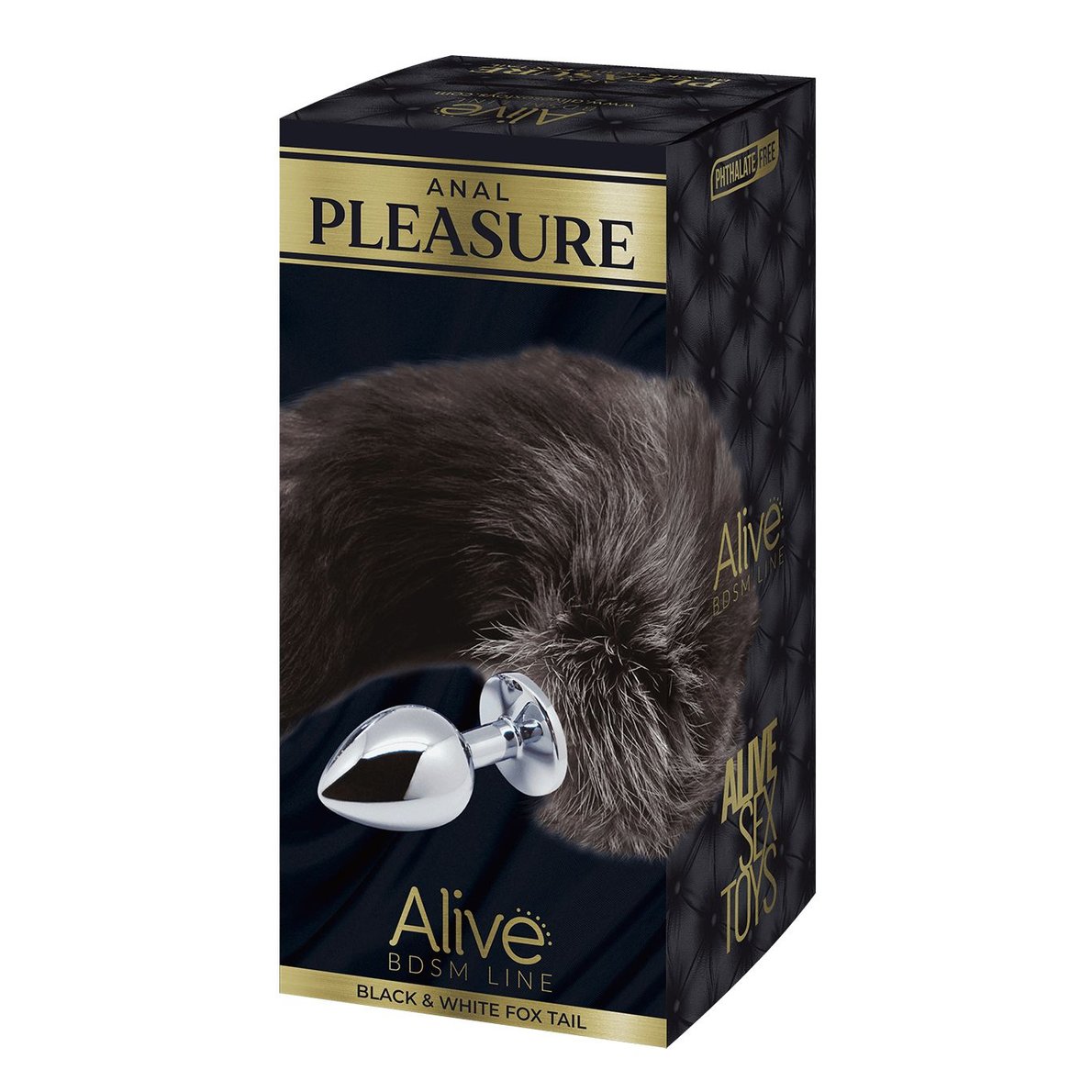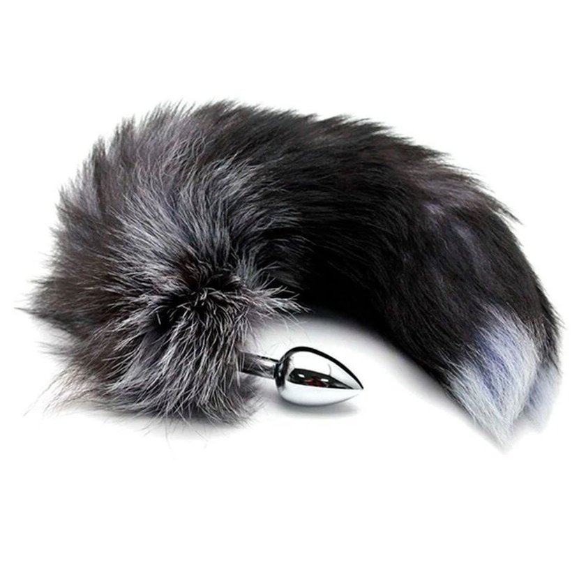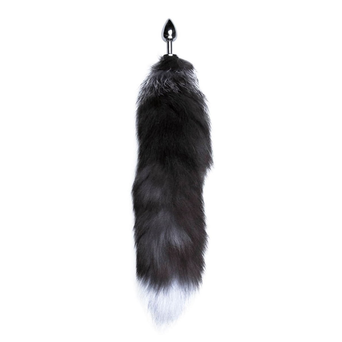 Серебристая анальная пробка с темным лисьим хвостом Black White Fox Tail Size S
